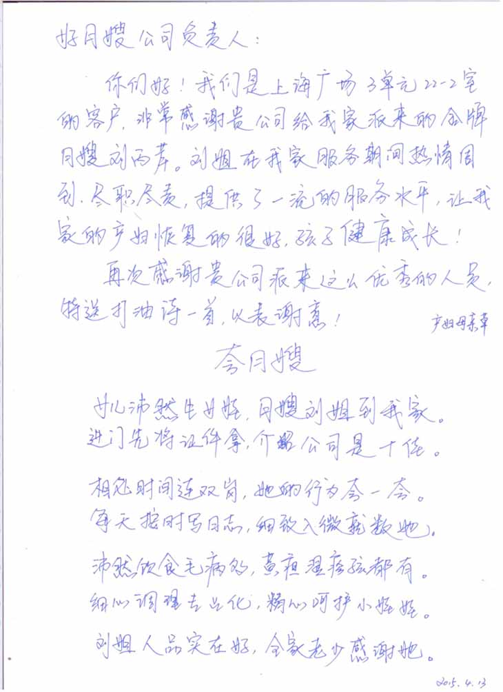 【发展故事】月嫂刘炳琴获得客户赠予的感谢信一封