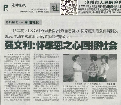 本报讯(记者 李小贤)“这是500元钱,虽然钱不多,但是我的一份心意,希望能够帮助社区中有需要的人。”家住市区朝阳小区一区的居民强文利将500元钱塞到社区书记曹建新手中。她说,如果条件允许,她今后每年都会捐出一笔钱。13年前,朝阳社区为生活困难的强文利办理了低保。这些年,强文利靠自己的努力改善了生活条件,不仅主动到社区取消了低保,还怀有一份感恩之心回报社会。