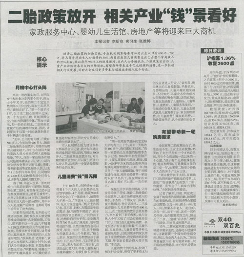 “周末我带孩子去玩,在商场门口收到房地产商派发的传单,上面的广告语就是‘全面放开二胎,你需要一所大房子’,商家出手够快呀。”市民韩先生笑着说。